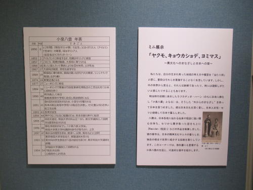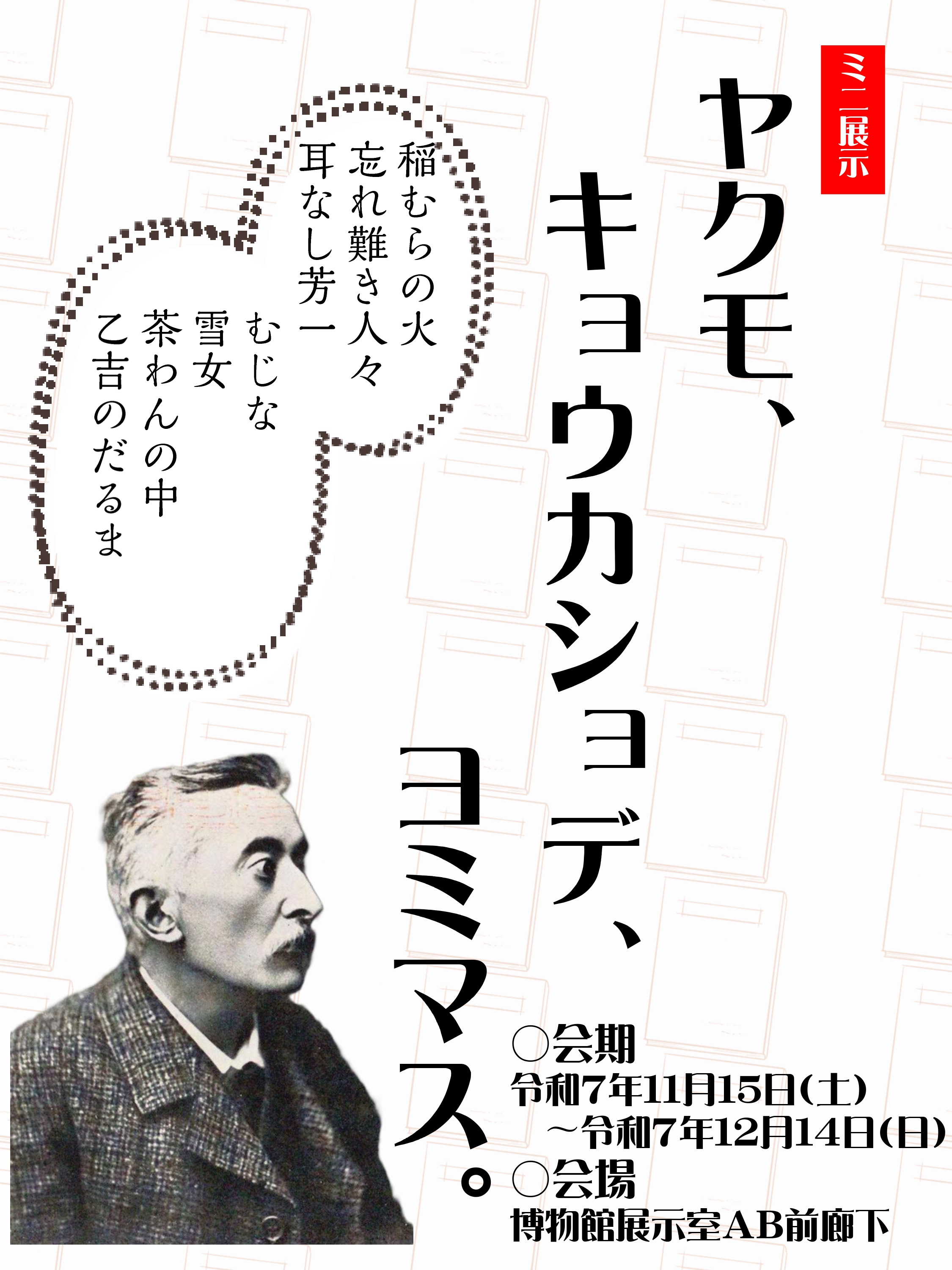 今回のミニ展示では、小学校・中学校で学ばれた八雲の生涯と著作を当館所蔵の教科書を中心に紹介します。