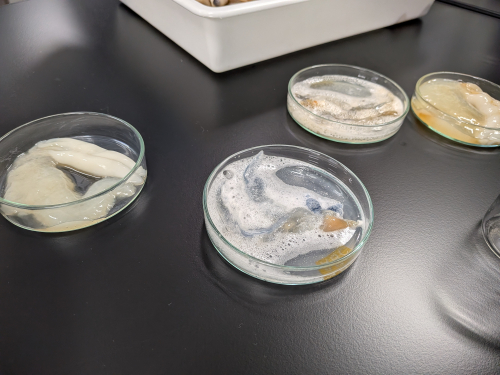 午前中の講義で、イカやタコなどの頭足類について学びました。頭足類は「頭から足が生える」という独特な体の構造を持ち、歯舌や外套膜、排水を行う「ろうと」など、軟体動物に特有なヒトとは異なる特徴があることを学びました。解剖では、雌雄の判別方法や循環系・消化系の確認、脳や眼の神経節の観察を行いました。特に、イカの脳を食道が貫通していて脳がドーナツ状になっていることを初めて知りました。