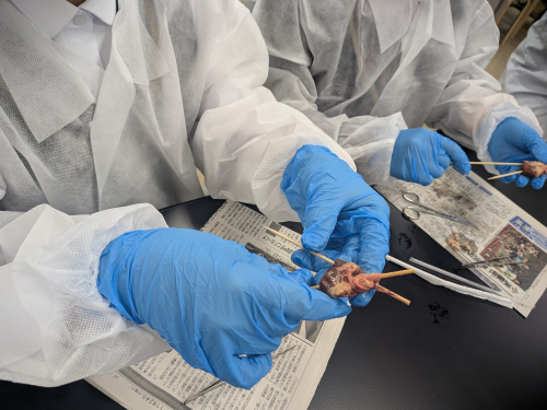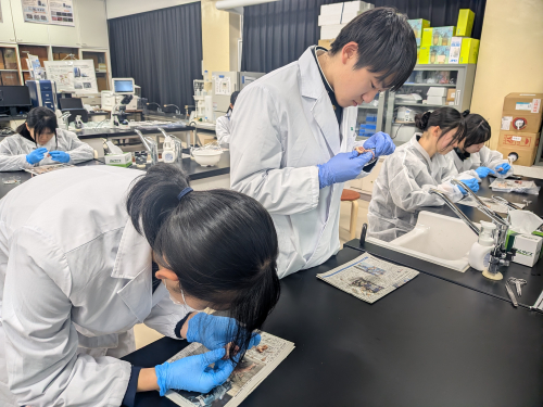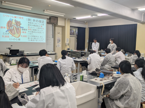 「学校で解剖をする機会は中々ないので、今日一日でたくさん解剖することができてよかったです。実際にスルメイカの内臓など体の作りを目にして感動しました。また、ニワトリの心臓の構造を観察して、予想とは違う結果になったり結果から考察したりできたのはまさしく探究活動で、とても良い経験になりました。」