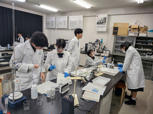 原理を理解したら、いよいよ実験開始です。試薬の調製に使うメスフラスコを手にした瞬間、教科書でしか見たことのない器具を扱う緊張感が走ります。ホールピペットで液を吸い上げる手が、わずかに震える参加者も。終点で赤から青への変化を目にしたとき、思わず声をあげる生徒もいました。