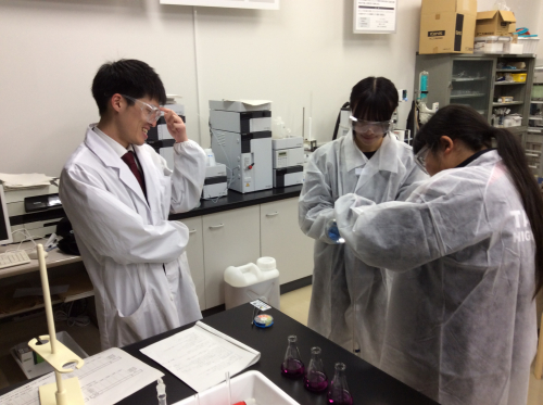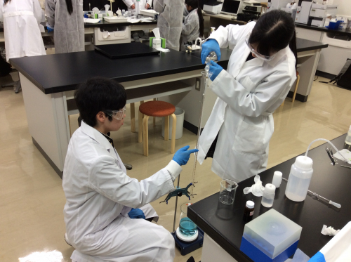 「実際に手順に則って実験を行い、そこから計算で濃度を導き出すのは、とてもいい経験になりました。初めは実験操作が難しくて手間取りましたが、やっていくうちに器具の使い方や滴定に慣れることができました。協力して実験を進めていくのも楽しかったです。計算では、ただ単に公式に当てはめるだけではなく、考え方や他の課題でも使えるテクニックを学べて良かったです。今回の講座を通して、自分の手で実験する楽しさや考察する面白さを実感できました。化学への興味が増したので、これからもっと深く学んでいきたいです。」
