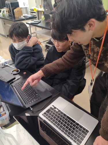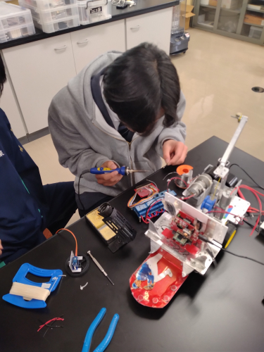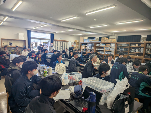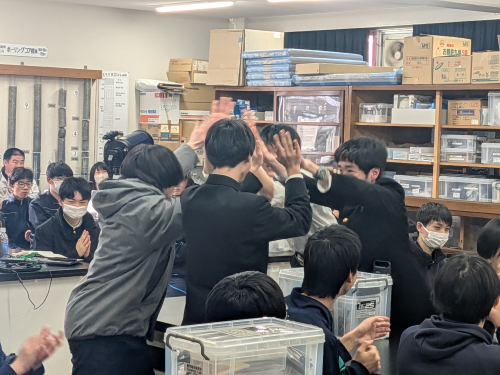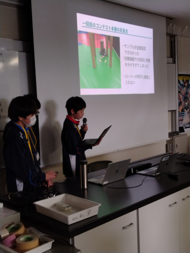 午後には、最終コンテストの結果とその分析内容を盛り込んだ、これまでの製作作業における探究の成果を報告する成果発表会が行われました。コンテスト結果の分析としては、AIによる物体認識を行うための機械学習を画像データ2988枚分行った結果、物体認識の信頼度0.9以上を達成したこと、9軸センサーによる角度データが取得できなかっため自律動作での進路特定ができなかったこと、音情報取得による進路特定の際に壁での反射音を感知したことでローバーが壁に向かって進んでしまったこと、などが報告されました。来年度に製作を引き継ぐ後継者たちに向けた今後の展望としては、より正確なマッピングデータを作成してほしいこと、分散型探査のための子機製作をしてほしいこと、3Dプリンターを用いてローバーの外見を整えてほしいこと、などが報告されました。