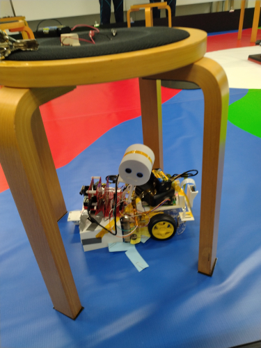 事前プレゼン後、各チームがローバーの最終調整を行い、その後、いよいよ最終コンテスト1回目が行われました。多くのチームが、ローバーが自動的に進行経路を判断し動作するという難易度の高いプログラミングによる自律動作の実現を目指して、コンテストに臨みました。各チームが作成したプログラミングの内容には、AI機能で学習させた目標物の物体認識を行い進行方向を特定する、コンテストコースのマッピングデータをもとに動作経路を判断する、マイクセンサーによりコンテストコースに設置された音源方向を特定して動作する、などがありました。練習ではうまく動作したのに本番では予期せぬ不具合が生じ対応しきれなかった、というチームもありましたが、コンテストの得点は1回目と2回目の得点で高かったほうが採用されるため、コンテスト1回目の後にはどのチームも2日目のコンテスト2回目に向けて、必死に機体調整に取り組みました。