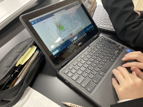 chromebookと、モーションセンサーを接続し、力学台車(スマートカート)の運動を解析しました。水平面上や斜面上で等加速度運動させ、得られたデータから作ったx-tグラフとv-tグラフを分析することで、加速度を求めました。実験結果をグラフ化することで、力学台車と床の間のわずかな摩擦力が確認できることに気づき、その摩擦係数を求めました。午後からは、その摩擦係数が、速さ・質量・角度のどれに関係あるかを求めるため、条件制御を意識して実験方法を考えて探究しました。最後には実験の考察をスライドで発表しました。